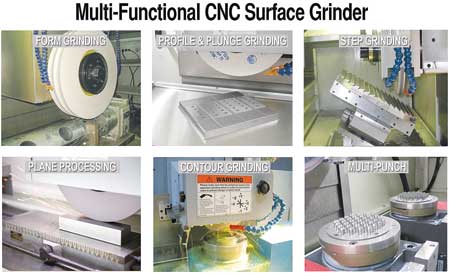 The SMART-B818III is capable of producing microfinishes of 5 RMS. The positioning accuracy is (±) 1 micron and the grinding accuracy is 1 micron. The SMART's movements are programmable in increments of 0.001 mm and include a table size of 8" x 8". The maximum distance from table to spindle centerline is 18" and wheel spindle is rated at 1,000 - 7,000 RPM and 3 HP. The SMART's standard grinding wheel size is 8" x 1/2" x 1-1/4". The machine weighs approximately 2,665 lbs, with dimensions of 80.9" x 82.36" x 82.7".