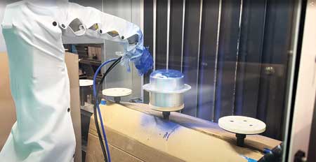 A robotic spray system applies coating to a rotor while it spins on a Chain-On-Edge spindle, allowing full 360° coverage with minimal overspray.