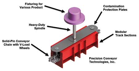 Some advanced designs include an enclosed track with bearing load wheels and upper and lower stabilizing bearings, providing smooth, wobble-free movement even under heavy or tall parts. Chain pitch, spindle size and load capacity are all tailored to match part geometry and production requirements.