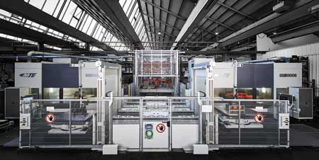 The plates exit the buffer storage through a rotating and transport mechanism.