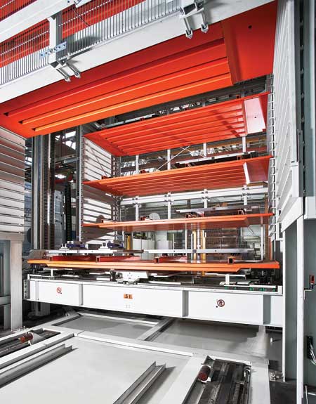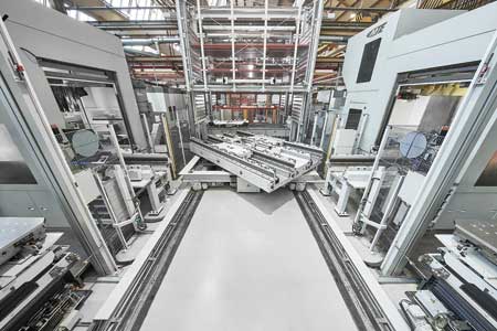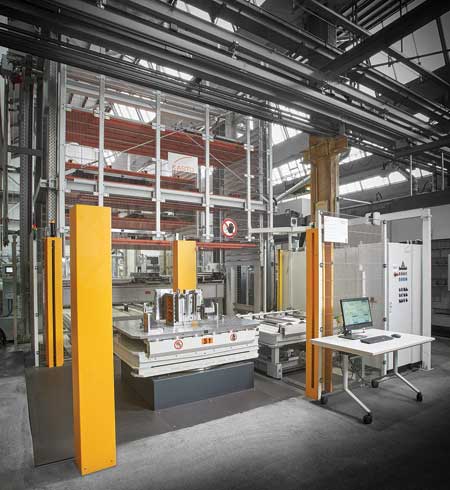 Companies can connect several metalcutting machines, regardless of the manufacturer, to one tower storage system. The UNITOWER cnc can be connected fully automatically to several set-up stations and transfer stations through traversing units and roller conveyors. The overhead gantry crane (OGC) transfers the machine pallet, which is loaded with fixtures and workpieces, to a transfer trolley. The transfer trolley automatically takes them to locations assigned by the control system. Partially and fully machined workpieces are returned to intermediate or final storage in the same manner.