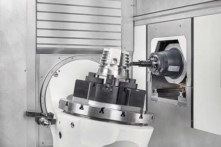 The GROB G350T provides greater positioning flexibility due to the axes' large swivel range (230° in the A-axis and 360° in the B-axis). A horizontal spindle position permits the long Z-travel path and optimum chip fall. The table is optimized specifically for mill/turn operations, capable of achieving 1,200 RPM on the B-axis.