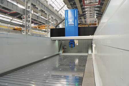 The system offers a broad and flexible working envelope to meet a wide range of production needs. Longitudinal (X) travel starts at 157" (4,000 mm) and is configurable up to 1,318" (33,500 mm), transversal (Y) travel starts at 118" (3,000 mm) and can be extended to 256" (6,500 mm) and vertical (Z) travel starts at 59" (1,500 mm) and reaches 118" (3,000 mm). This scalability makes it suited for machining large and complex parts, whether in single-piece manufacturing or in high-volume, fully automated workflows.