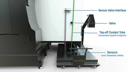 Software defines target tank levels and concentrations for each CNC machine. Mixing manifolds near each machine combine this coolant with water from a supply line that runs in parallel with the coolant line. Coolant leaves the manifold and arrives at each sump at the machine-specific top-off concentration. From there, users can use the FullShop App as a hub for coolant trends, notifications and more.
