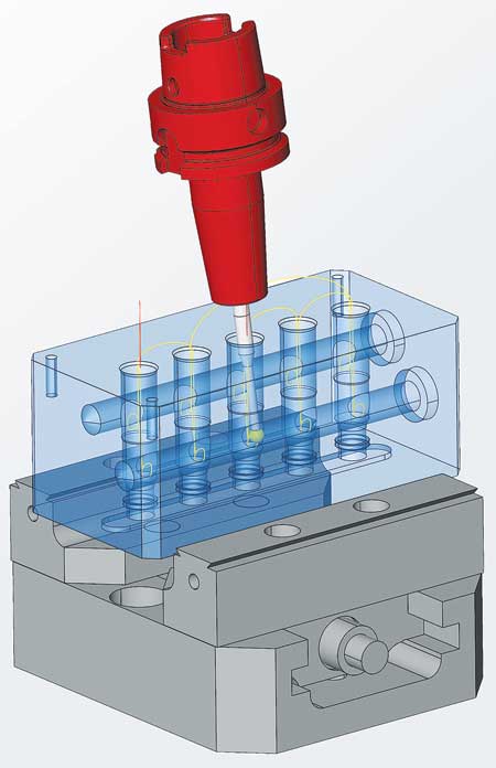 A new 5-axis hole deburring strategy deburrs sharp edges on holes and intersecting holes. By using CAM Plan programming assistance and analysis technology to automatically recognize all the holes, the sharp edges in the model are marked for selecting the desired edges. The hole deburring technology automatically calculates toolpaths and supports 3-axis and 5-axis modes. Also, hyperMILL now offers a 5-axis deburring strategy for fast and efficient deburring of component edges. Users may choose between 3-axis machining and a 5-axis option that enables greater reach to more component edges, automatically generating the required inclinations as well as collision avoidance.