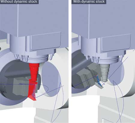 Linking movements via hyperMILL VIRTUAL Machining Optimizer have been further optimized for actual stock conditions with new Dynamic Stock technology. Using Dynamic Stock, an updated stock is automatically generated for all machining jobs and accounted for when calculating linking movements.