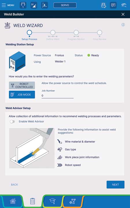 Weld Builder features a user-friendly interface with a step-by-step guided process for creating weld jobs through the Weld Wizard. This intuitive tool is designed to help users, especially those new to robot welding, by guiding them through their first weld job and helping them select appropriate welding parameters. The software also includes a Weld Advisor, which, in conjunction with the Weld Wizard, suggests potential welding parameters based on user-defined welds, offering a valuable starting point for robot travel speed and weld parameter data entry.