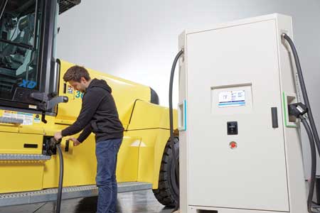 The J230-400XD series is available with a range of battery sizes to match duty cycle and charging requirements, configurable up to 280 kW. The 350-volt architecture provides a right-sized solution for ICE-like performance and energy efficiency. This solution offers long run times and minimizes energy loss without the additional cost and complexity of higher-voltage systems, the company noted. Hyster now offers this model series of integrated lithium-ion big trucks with load capacities from 23,000 to 40,000 lbs. and 24", 36", or 48" load centers.