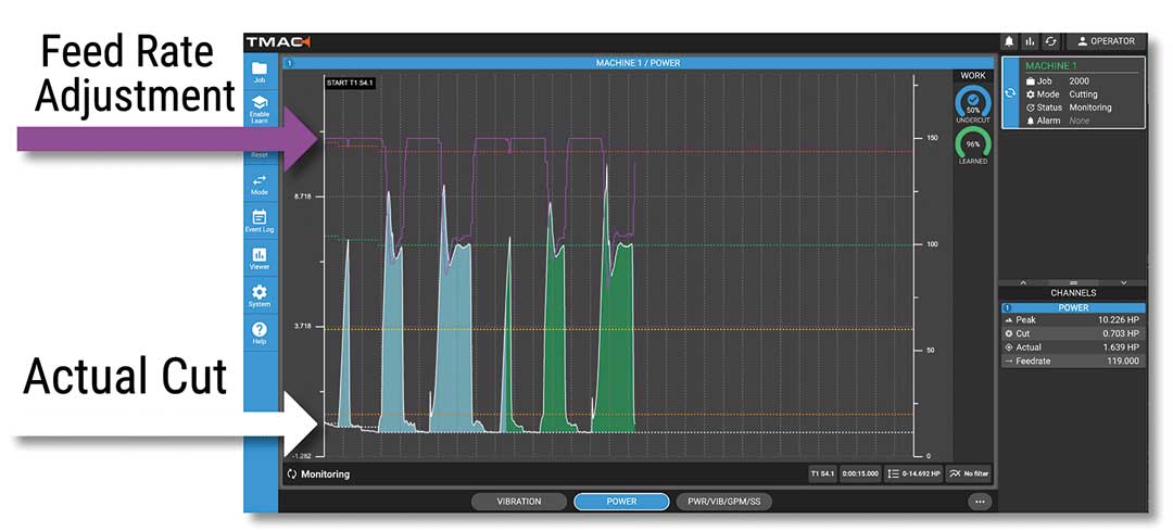 TMAC learns the optimal power for each toolpath-establishing upper and lower power thresholds based on the learned optimum power for each tool and cutting section. If cutting power deviates from these limits, TMAC reacts instantly, stopping the machine within 5 milliseconds of an extreme alarm to prevent damage to the tool, part, and fixture. Based on learned limits, TMAC will register an alarm if any condition deviates beyond the acceptable cutting parameters and stop the process.