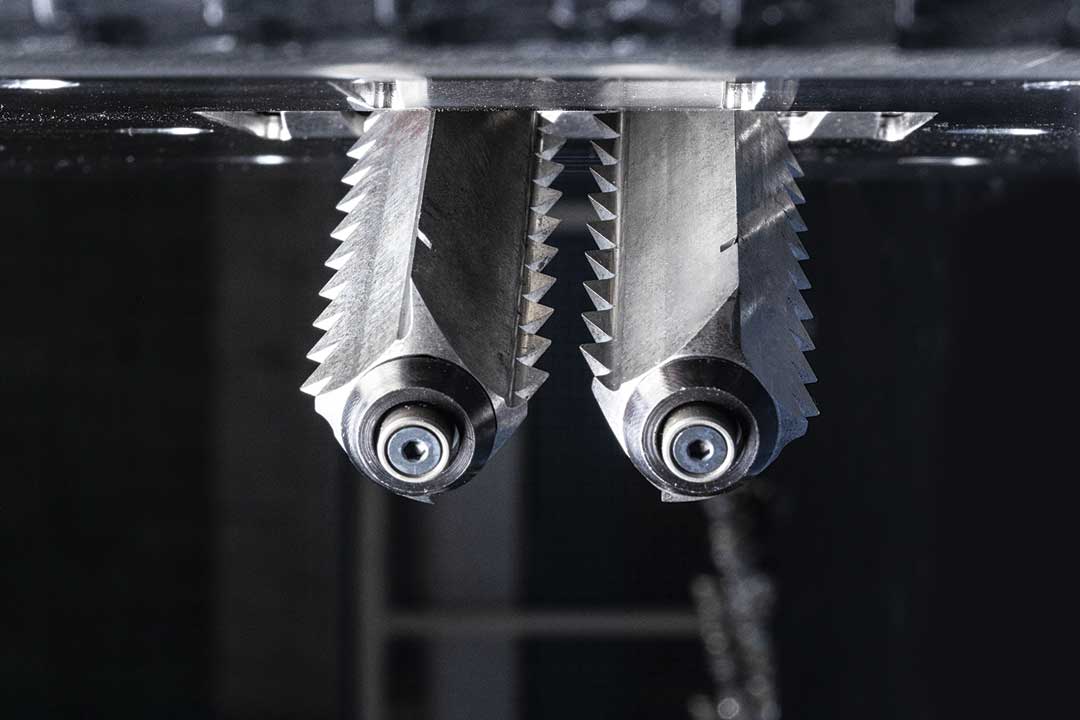 TRUMPF's cleaning method removes the slag in a two-step roughing and finishing process. The developers equipped the cleaning tools with serrated and continuous cutting edges. The rotating tools are arranged to the right and left of the slat. The serrated cutting edges break up the slag, while the continuous cutting edges scrape it off. This process runs continuously, allowing cleaning to proceed at a speed of 13 to 32 FPM.