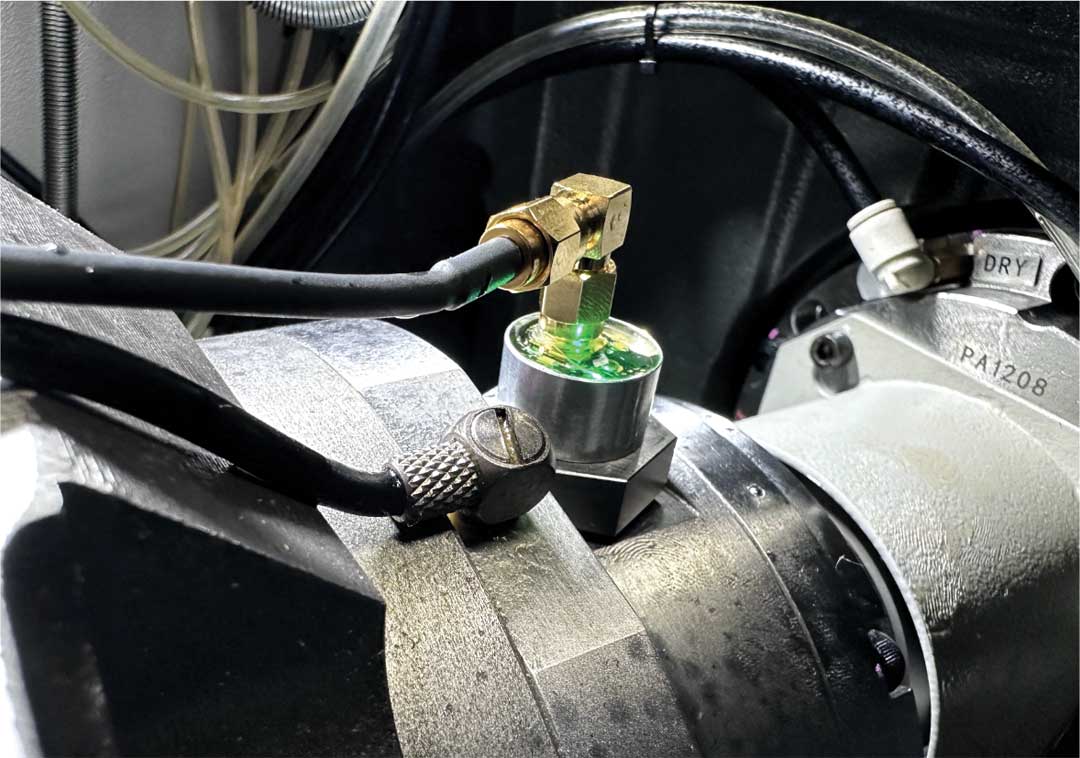 DTect-IT uses a high-resolution vibration sensor mounted on the main spindle to continuously monitor vibration signals during cutting. When vibration exceeds user-defined thresholds: