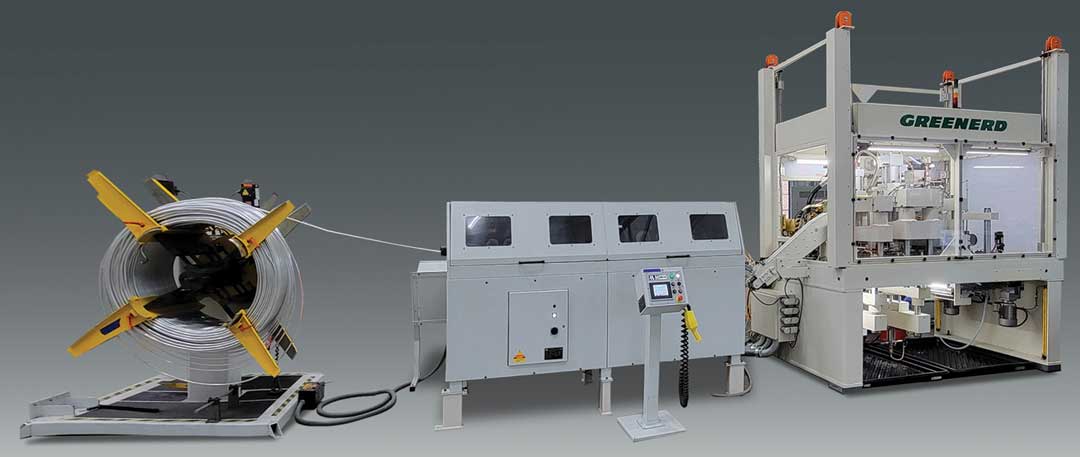 Greenerd designed, engineered, and built this automated press system, which manufactures aluminum electrical splices at a rate of 60 parts per minute. The system feeds a coil of aluminum through a straightening and shearing process controlling the weight of slugs that are fed up an inclined custom, Greenerd-designed conveyor and diverter, separating the slugs into lanes for increased throughput. In total, the system performs multiple operations from straightening and shearing to dimpling, hole formation, chamfering, and grooving via a custom servo-driven shuttle system.