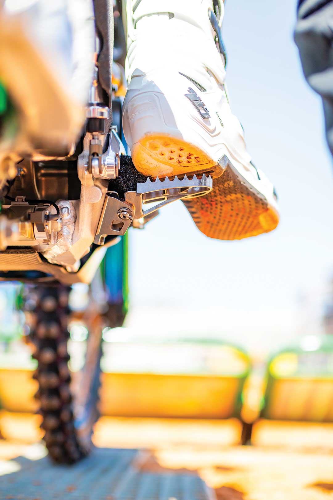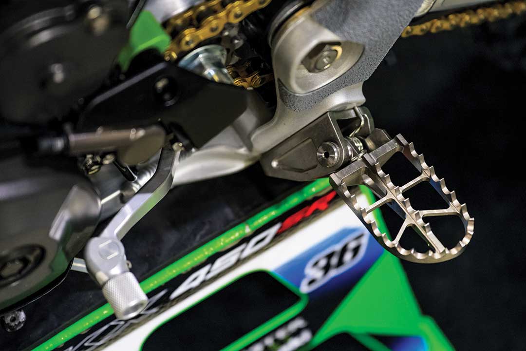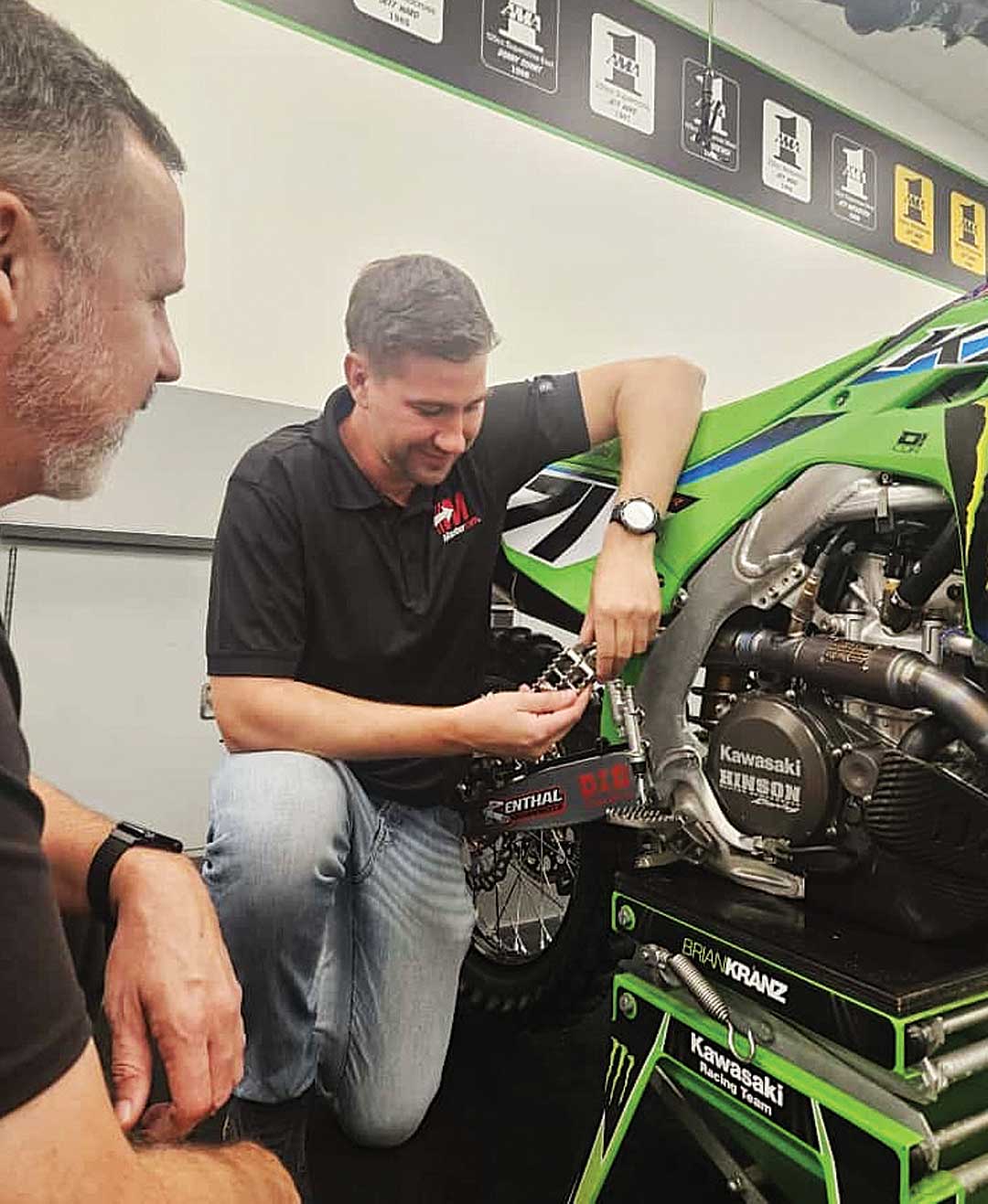 Jeremy Robinson from Kawasaki and Patrick Aiple from CCCS discuss customizing the foot pegs of Garrett Marchbank's competition bikes.