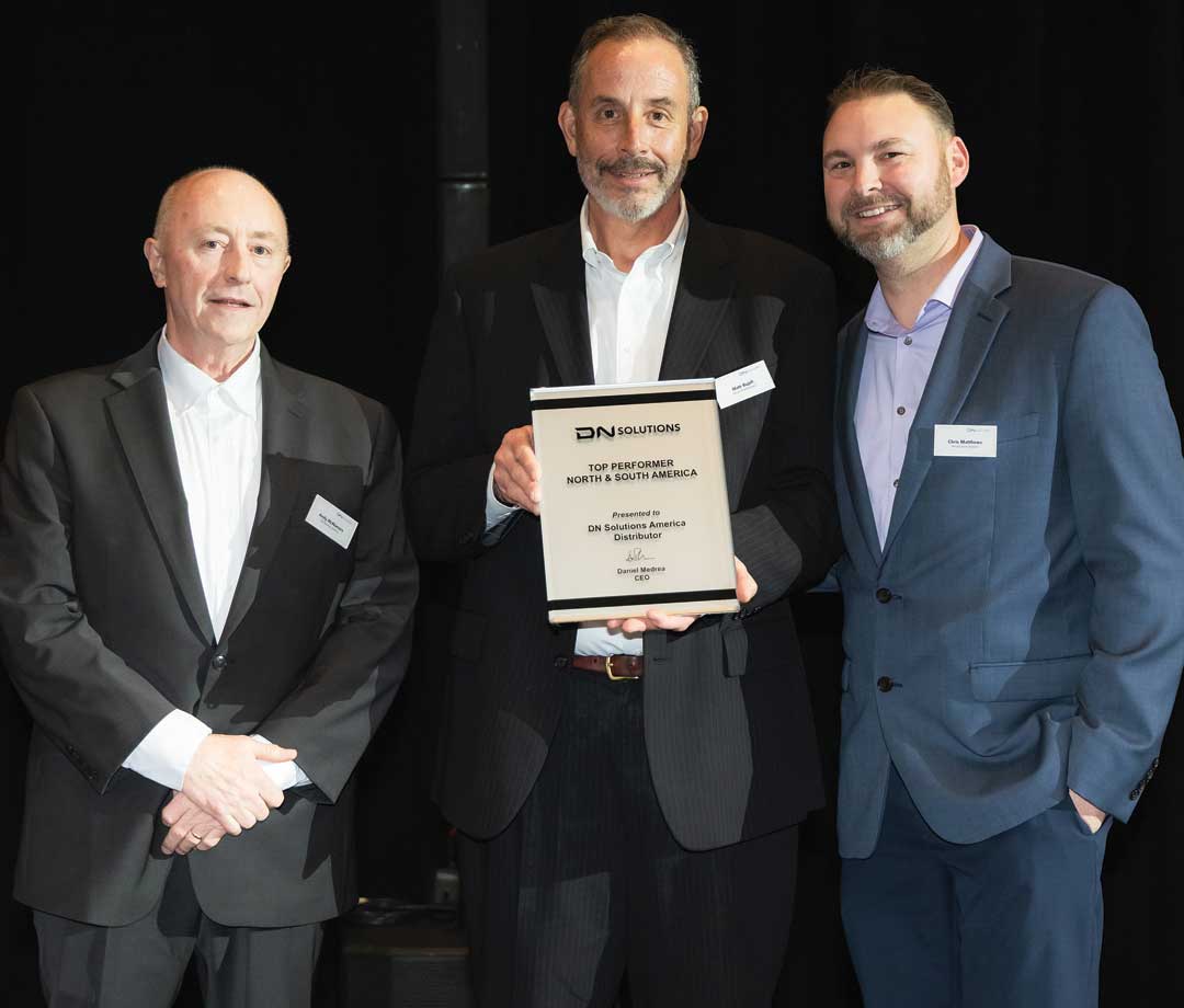 Ellison Tech Cleveland DOY 1-LEAD: (l-r) Andy McNamara, Vice President of Sales, DN Solutions; Matt Bujoll, President, Ellison Technologies Ohio; and Chris Matthews, Northeast Regional Sales Manager, DN Solutions, with the Distributor of the Year Award.
