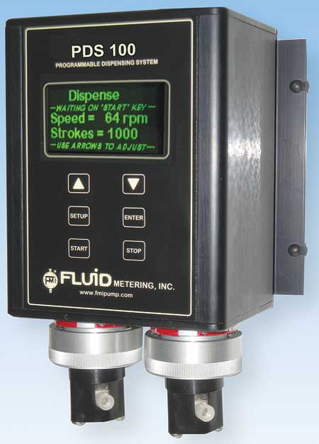The PDS-100 is available in both single and dual channel configurations and can be integrated with industrial process controllers. Dispense and metering rates range from a few microliters per dispense up to 768 ml per minute continuous metering.