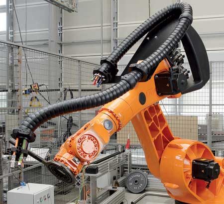 igus offers cable guidance systems for a range of robotic applications, from small welding robots to large palletizing robots. The latest addition to its multi-axis cable carrier line is an adjustable retraction system. Triflex RSP is designed for secure cable guidance on large robot arms or for robots programmed to perform complex movements.