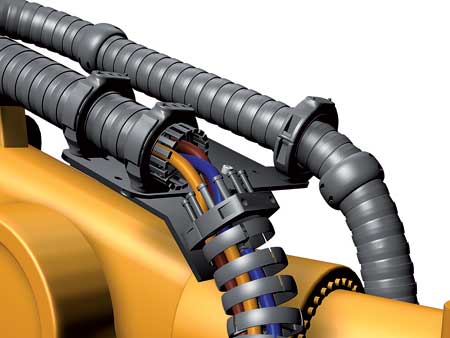 Triflex R multi-axis cable carriers from igus can be used for power, data and media supply. The Triflex R range is specifically designed for robot operators and currently has around 250 components to guide cables and hoses securely through multiple axes. Three main designs are available: a fully enclosed design for cable protection in harsh applications; an "E-Z" version, into which cables and hoses can be pushed by hand; and a lightweight version that is lower cost and designed to be rapidly assembled.