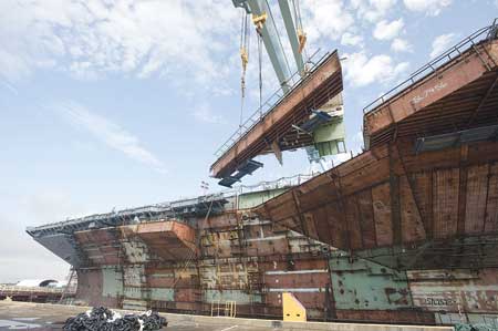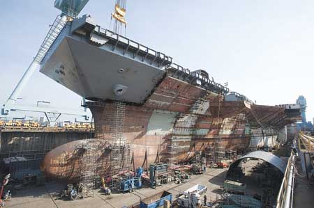 The flight deck of the aircraft carrier Gerald R. Ford (CVN 78) was completed on April 9, 2013, with the addition of the upper bow. The bow weighs 787 metric tons and brings Ford to 96 percent structural completion. Photo courtesy of Huntingdon Ingalls Industries.