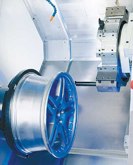 The lathe features 35 HP, AC digital spindle motor with a two-speed gearbox and 12" hydraulic chuck. It produces 735 ft-lbs torque at lower RPM.