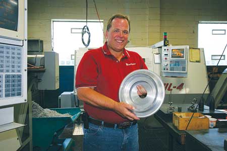 Daniel Galli, TapeMaster Vice President / Engineering Manager, holding a starter support assembly for Textron Lycoming in the machining cell where they are produced.