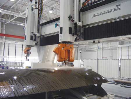 Flow's CMC was created as a one-stop processing center for composite parts that have been autoclaved. It can be configured as a mid-rail gantry or dual traveling column machine. The gantry design carries two rams on a single gantry with a 5-axis wrist on each ram, one for ultra high-pressure waterjet cutting and one for conventional high-speed routing. The CMC can do all the finish machining on a wing skin - trimming, drilling, routing, surface milling, marking and inspection - in one set-up, and parts leave the machine ready for assembly. The machines are widely used by Airbus partners around the world.