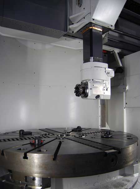 The C-axis head provides +/-45° rotation, creating a machining range of Y-axis features of +/- the VTC table radius. The continuous power 22 kW (29 HP) attachment has a maximum spindle speed of 2,200 RPM and continuous torque of 875 Nm (645 ft-lbs.) and can be loaded manually or automatically via the machine's automatic toolchanger. A live spindle accommodates standard Kennametal KM80 or Sandvik Coromant Capto C8 tooling. Coolant delivery via external nozzles on the face of the attachment or through-the-spindle coolant is provided.