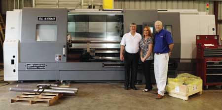 (l-r) Frankie Martin and Susie Martin, owners of Alpha Machine & Fabrication, Inc., and Jim McDaniel of McDaniel Machinery are shown with a Samsung SL45MC/2200BB 3-axis CNC turning lathe with live tooling. Partially machined raw material is displayed on a wood pallet on the bottom left.