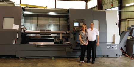 (l-r) Susie Martin and Frankie Martin, owners of Alpha Machine & Fabrication, Inc., are shown with a Samsung SL65/3200. The machine is holding a blank gear shaft.