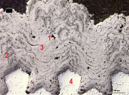 Fig. 1: Non-machined thermal sprayed layer (PTWA method) with pores (1), oxide lamella (2), shrinking splits (3) and roughened substrate profile with undercuts (4)