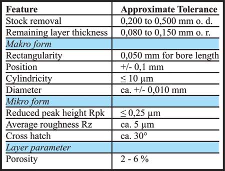 Principally the machining task is to achieve a designed smooth and functional surface starting with the rough sprayed layer surface of a cylinder bore. The finished condition of the cylinder bore has to meet the functional requirements with diameter, roughness as well as form and position tolerances under conditions of high volume production. In Fig. 2 the relevant quality features for the function including their respective approximate tolerances are summarized.