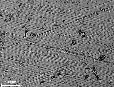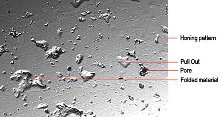 Fig. 3: Finish honed surface of a PTWA layer with pores, honing grooves and pullouts