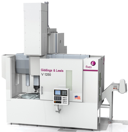The V Series is designed and built at the Fives Giddings & Lewis plant in Fond du Lac, WI, and features solid cast iron base construction. Available options include live spindle attachments and a C-axis table.