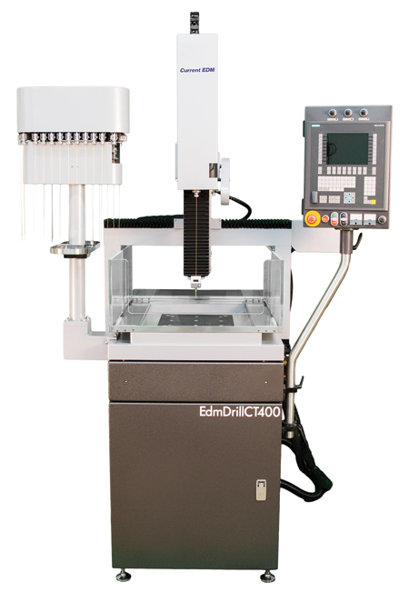 The Current EDM Model CT400 EDM Drilling Machine is a production EDM drill for use in the general metalworking, medical, aero engine and power-gen industries. The CT400 features a choice of either the Siemens M Control or the Siemens 840D control. Depending on the application, a 25 Peak-Amp (0.0012" ~0.070" dia. electrode range) or a 57 Peak-Amp (0.004" ~0.256" dia. electrode range) power supply is available. XYZ travels are 16" x 12" x 16" with a table capacity of 1,000 lbs.