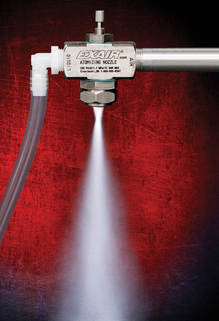 A variety of atomizing spray nozzles coat, cool, treat and paint a variety of products using compressed air and liquids with a viscosity of up to 300 centipoise. Used with water, atomizing nozzles are an efficient way to evenly cool hot items in an automated process. They are also commonly used with light oils, rust inhibitors, chemicals, paints and dyes.