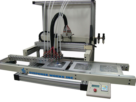 The RC Series features Dispense Works' gantry robot with an integrated slip roller conveyor system. The entire XYZ motion system is located above the dispensing plane to allow straddling over the conveyor with a rigid structure in a space saving compact package. This modular design will accommodate up to 16 valves making it suitable for multiple color applications.