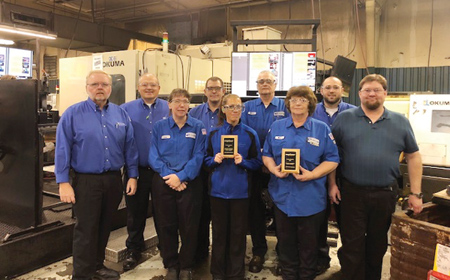 Front row: Jim Stewart, Operations Mgr.; Lisa Schwarz, CNC Operator; Jamie Espinoza, CNC Operator; Barb Fulk, Quality Tech.; Fred Bolger (Nexteer)