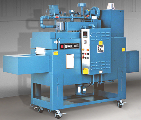 No. 831 oven is a 950 °F (510 °C) belt conveyor oven from Grieve, currently used for heat treating springs at the customer's facility. Workspace dimensions of this oven measure 14" W x 54" D x 3" H. To heat the oven chamber, 81,600 BTU/HR are installed in a modulating infrared natural gas burner. A 250 CFM, 1/3 HP recirculating blower provides vertical downward airflow to the workload.