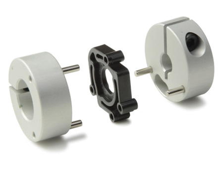 Controlflex couplings are comprised of two anodized aluminum hubs joined by pins to a Delrin frog.