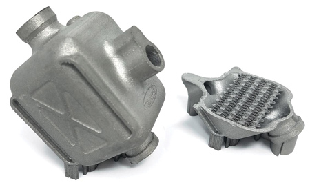 This heat exchanger test piece demonstrates Velo3D Sapphire's printing capabilities, including ultra-thin features in the core (visible in cut-away piece). All images are as-is off the printer with no post-processing (e.g., bead blast).