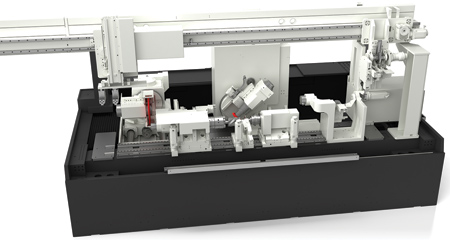 The machine concept is rounded off by a fully integrated internal loading gantry, which takes on the task of frictionless workpiece handling within the machine and the option to transfer the finished parts outside the machine. The loading gantry can be easily retooled for a new workpiece configuration using the quick-release fastener.
