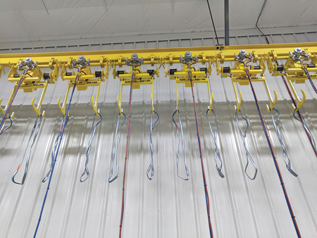The installation includes 20 custom wire rope, air-operated hoists with double sister hooks.