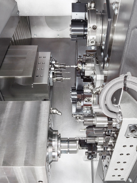 Overall tooling capacity has also been increased, with the capability to house up to 40 tools with the use of double and triple holders. This allows operators a greater degree of freedom to optimize machining of highly complex parts. Each of two 6-station tool turrets has its own servomotor and interpolated Y-axis, with chip-to-chip tool change times reduced to just 0.3 seconds.