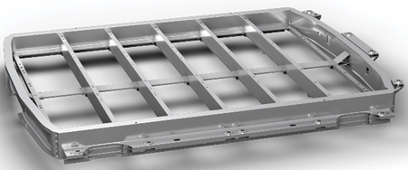 Tray construction made of aluminum profiles for holding vehicle batteries. The task of the robots is milling over the connecting surfaces for a cover to be attached later.