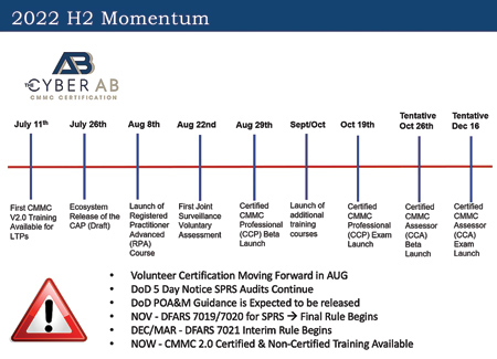 On July 26, 2022, the CMMC-AB now renamed the Cyber AB and announced very important updates combined with recent enforcement activities continuing by the DoD and OEMs. The DoD is expected to announce its limitation or restriction of certain uncompleted requirements on the plan of action and milestones. It is not known if the DoD will allow a set period of time for contractors to complete those tasks, or if they will immediately become non-compliant with DFARS flow-down requirements. Contractors are being determined to be ineligible to bid and current work is being redirected to compliant subcontractors. "Time is short, the standards are complex and tier suppliers over the next 6-12 months will be either growing revenue that was redirected from ineligible competitors or losing it," said Mark Boothe, President of TeamLogic IT of Dallas.
