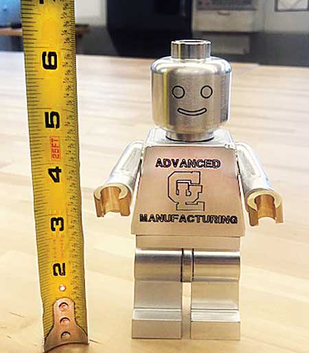 The aluminum figure stands just over 6" tall. Each piece of the assembly was machined on the lathe and mill. Working as a team, GLTS instructors used Mastercam Solids to create the model and fixturing.