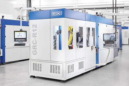 The GRC-R12 robot cell offers a flexible integrated automation solution for the GROB G150, G350a and G350 5-axis universal machining centers.