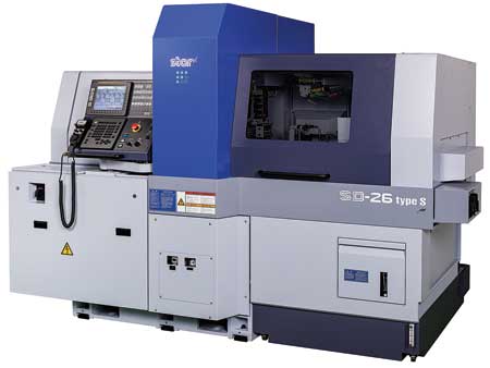 SD-26 Type S employs a gate-shaped gang style tool post including not one, but two B-axis stations, which are capable of programmable simultaneous 5-axis control. The first station features a dedicated 4-spindle milling unit, supported from top and bottom ends, enabling rigidity during swivel machining. The cartridge type second station offers a range of tool units, including the industry's first twin-thread whirling unit, the company reported.