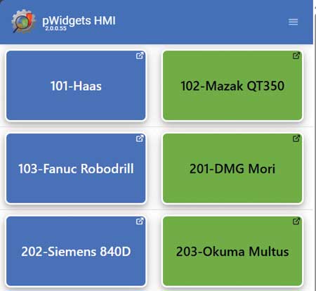 A cell of six machines, as accessible through the browser-based pWidget HMI for Predator DNC and MDC applications. The customizable pWidget touch interface gives Predator users the ability to view, control, send or receive CNC file programs as well as access specific machine data points across a variety of web-enabled devices.