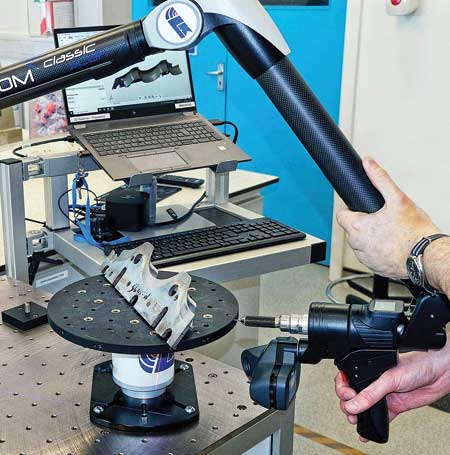 Superseding a smaller and now unsupported arm and touch probe, which were used alongside conventional, manually-intensive metrology equipment like calipers and height gauges, the new inspection area comprises a 7-axis, multisensor FREEDOM Arm Classic Scan with a 2.73 m reach equipped with a touch probe and an H120 laser line scanner, which since the end of 2023 has been manufactured by LK following its acquisition of Nikon Metrology's laser scanner hardware and software business. Together with a rotatable, 300 mm diameter FREEDOM Index Table, the lightweight carbon fiber arm is mounted on a metrology table, all elements supplied by LK. Additionally, Innovmetric's PolyWorks Inspector software was purchased from reseller 3D Scanners (UK) to provide advanced point cloud analysis, evaluate surfaces, measure geometrical features, generate colored heat maps for part-to-CAD or scan-to-scan comparisons, and generate full reports.