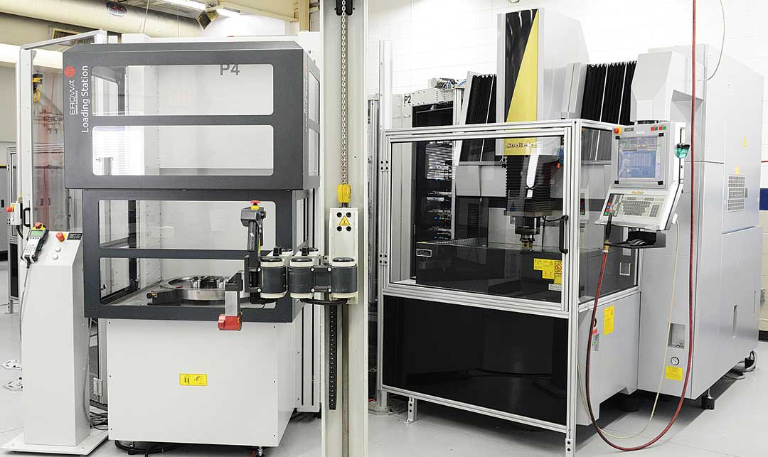 An Industrial Molds automated precision manufacturing cell features a high-precision EDM integrated with an EROWA Lift manual loader.